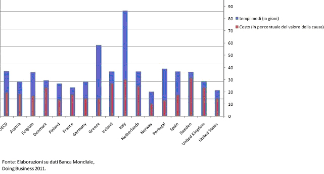 Nel nostro paese, la durata media dei processi civili ammonta a circa tre anni; in ragione di questo record negativo, l'Italia è collocata al 157° posto su 183 nazioni nella graduatoria annuale della Banca Mondiale e rappresenta, al contempo, il fanalino di coda dei paesi dell'OCSE.