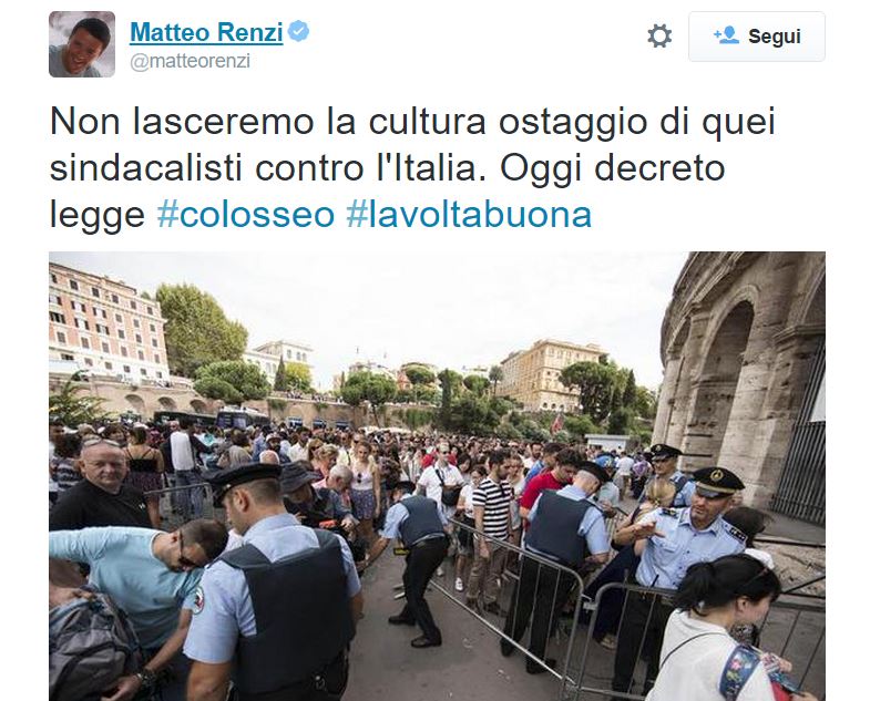 L'articolo preso da"Il fatto quotidiano"(http://www.ilfattoquotidiano.it/2015/09/18/colosseo-l-assemblea-sindacale-era-stata-chiesta-e-autorizzata-per-tempo-ecco-cosa-non-ha-funzionato/2047121/ )parla dei proclami a vanvera prima del Ministro della cultura Franceschini e poi della rappresaglia immediata del sempre più destronzo Renzi che già oggi delibererà un decreto legge che affosserà i lavoratori dei musei ed i loro diritti allo sciopero.